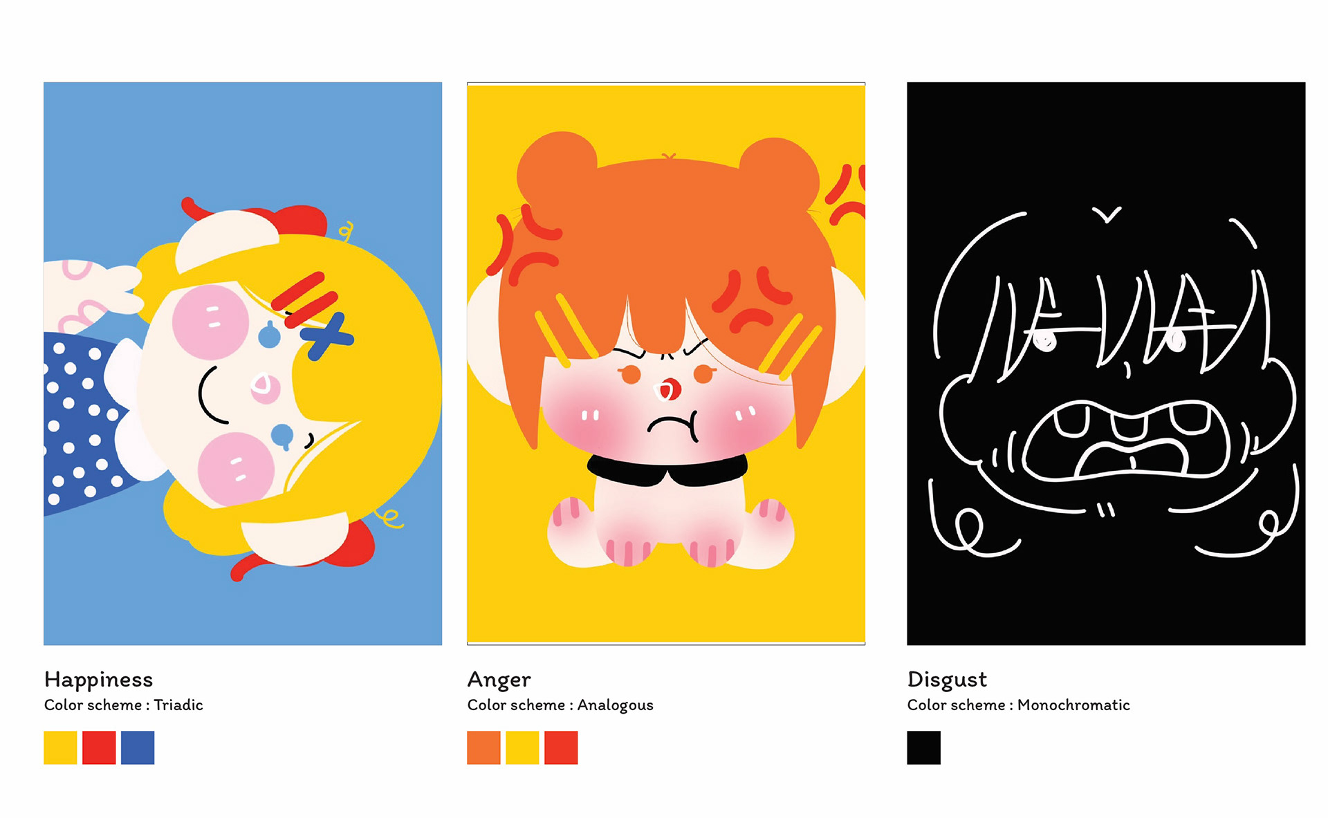 In the first image, the character shows happiness, represented by bright and vibrant colors to convey a sense of energy and joy.