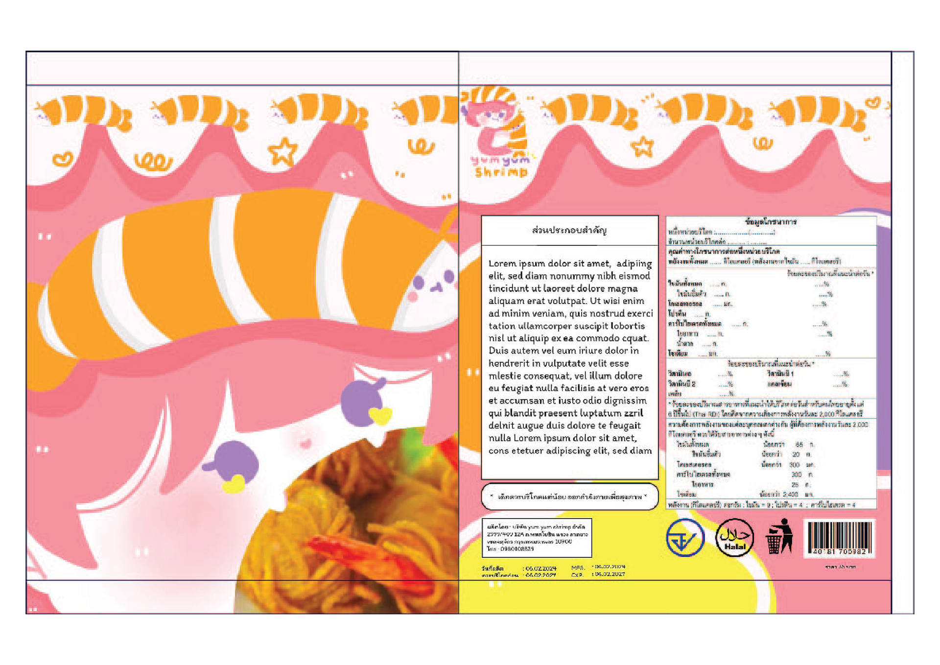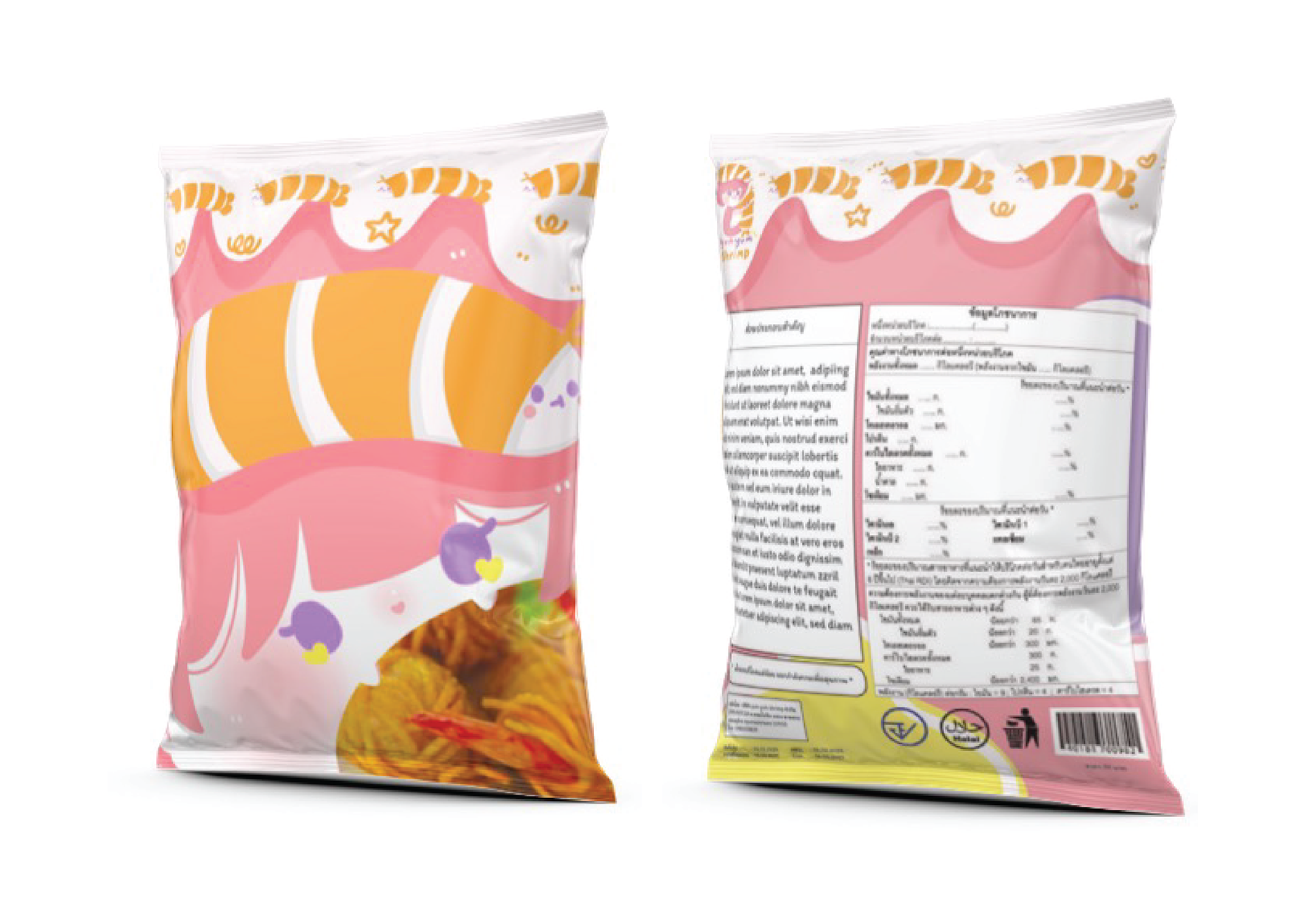 Yum Yum Shrimp is a dried shrimp snack designed for kids. The product is created to be cute, vibrant,